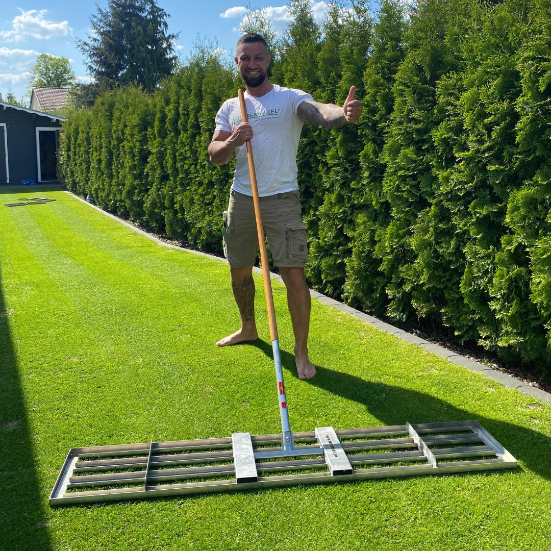 Gerade beim Anlegen einer neuen Rasenfläche ist das "Fundament" entscheidend. Bereitest du hier keine wirklich ebene Fläche vor, wir dein geliebtes Grün lange Zeit eine Hügellandschaft sein. Mit dem Rasenrakel kannst du von Anfang im Handumdrehen eine absolut ebene Fläche herstellen.